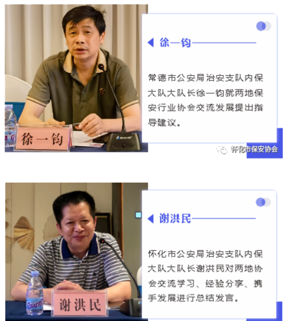 對于兩地協(xié)會此次的交流座談,徐一鈞大隊長和謝洪民大隊長分別作總結(jié)發(fā)言,他們表示常德、懷化兩地協(xié)會要加強交流學(xué)習(xí)與合作,在保安行業(yè)發(fā)展領(lǐng)域積極探索創(chuàng)新,多分享經(jīng)驗,攜手互助,為兩地保安服務(wù)規(guī)范化與高質(zhì)量發(fā)展在全省作出亮點而并肩努力。